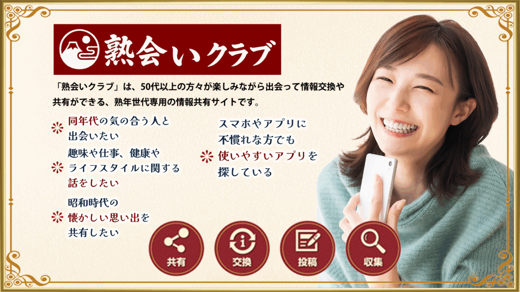 熟会いクラブは、50代以上の熟年層に特化した情報共有アプリです。