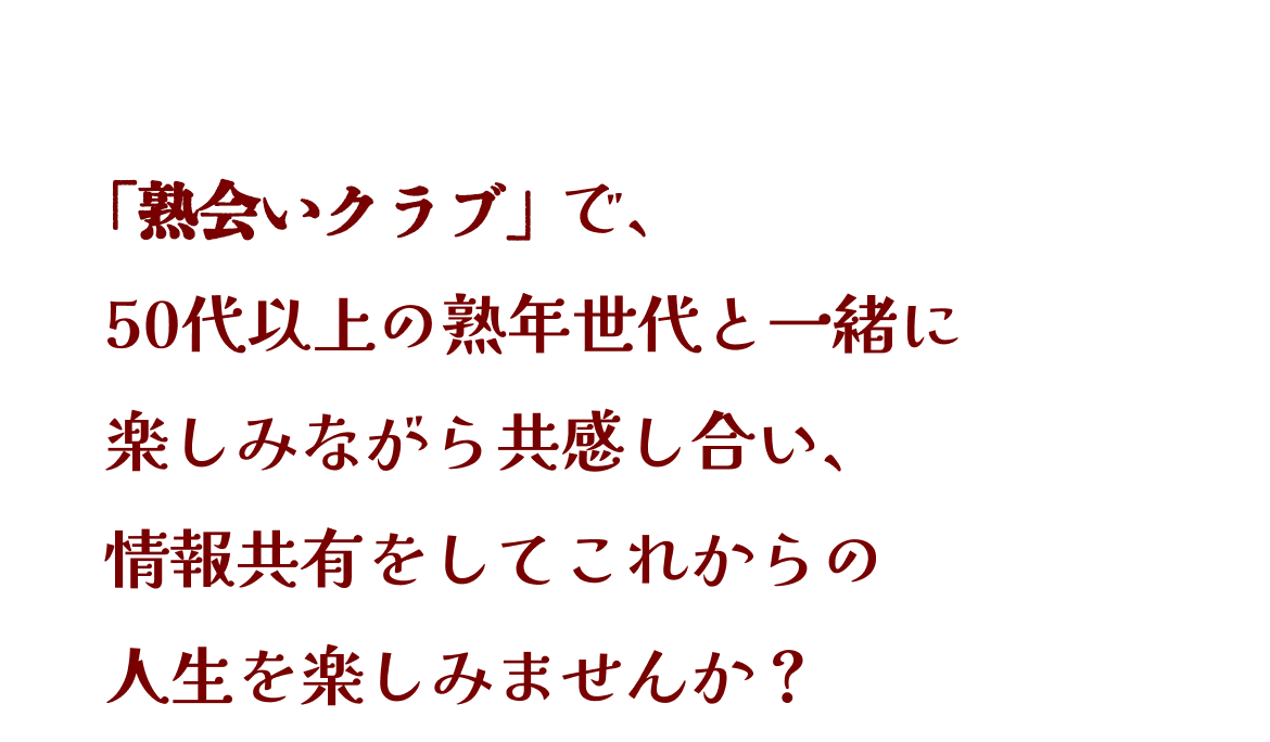 熟会いクラブは、50代以上の熟年層に特化した情報共有アプリです。